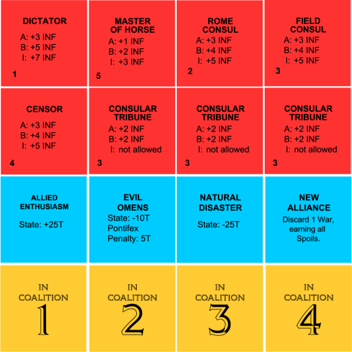 With this expansion you can at last move beyond solo mode and invite a fellow player to a seat at the table. Now the two greatest Asian dynasties of the period, the Han and the Kushan, can compete to see which can cover themselves in the most glory. One is tiny, but has great potential. The other is quite large, but has so many problems that need fixing. Who will triumph? The kit adds rules for Corruption and Authoritative Emperors, plus more Ares (now with flavor text), Fate and Science cards. Shop page | Home | Rules |