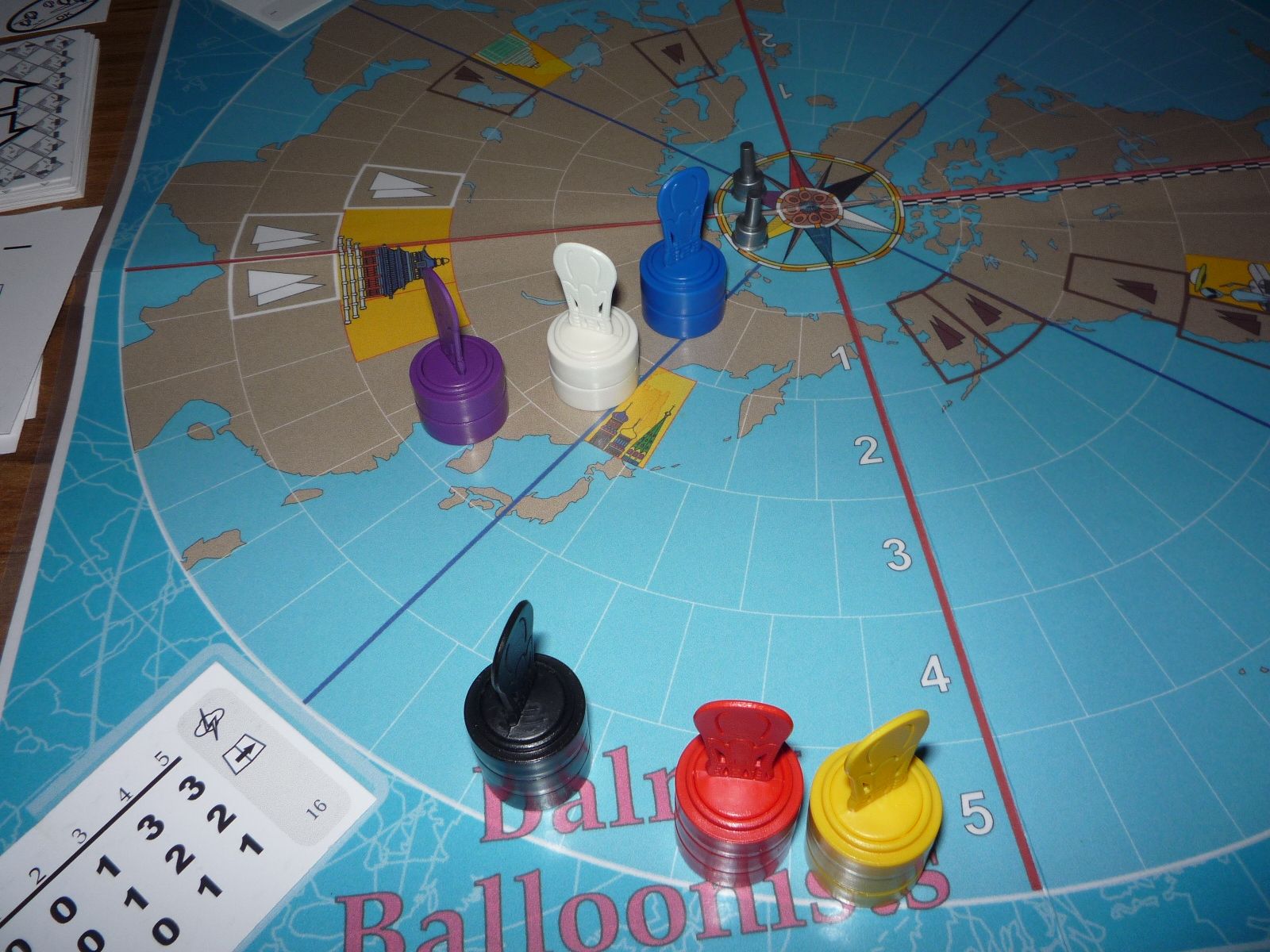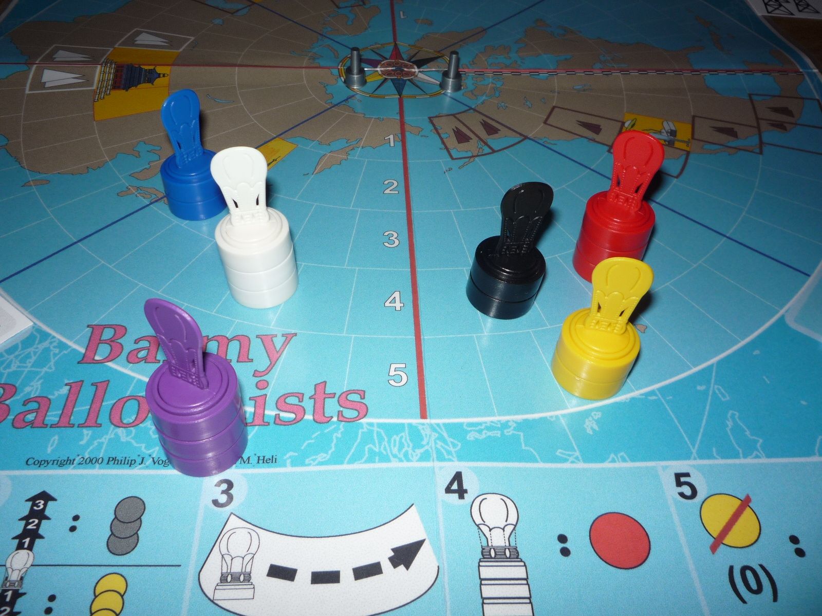 The world sends up a hurrah for today begins the Great Balloon Race! Making last-minute preparations before sunrise, the balloonists await the weatherman's signal. The blue-red flames of the burner bring the majestic silver balloons to life. Head-first they climb into the gondola. The hatch is sealed, the clamp closed. You give the signal and silently their balloon begins to rise, with it, the balloonists' hopes of victory. The starting positions. The best winds are around latitude level 3 and the balloons set up accordingly.