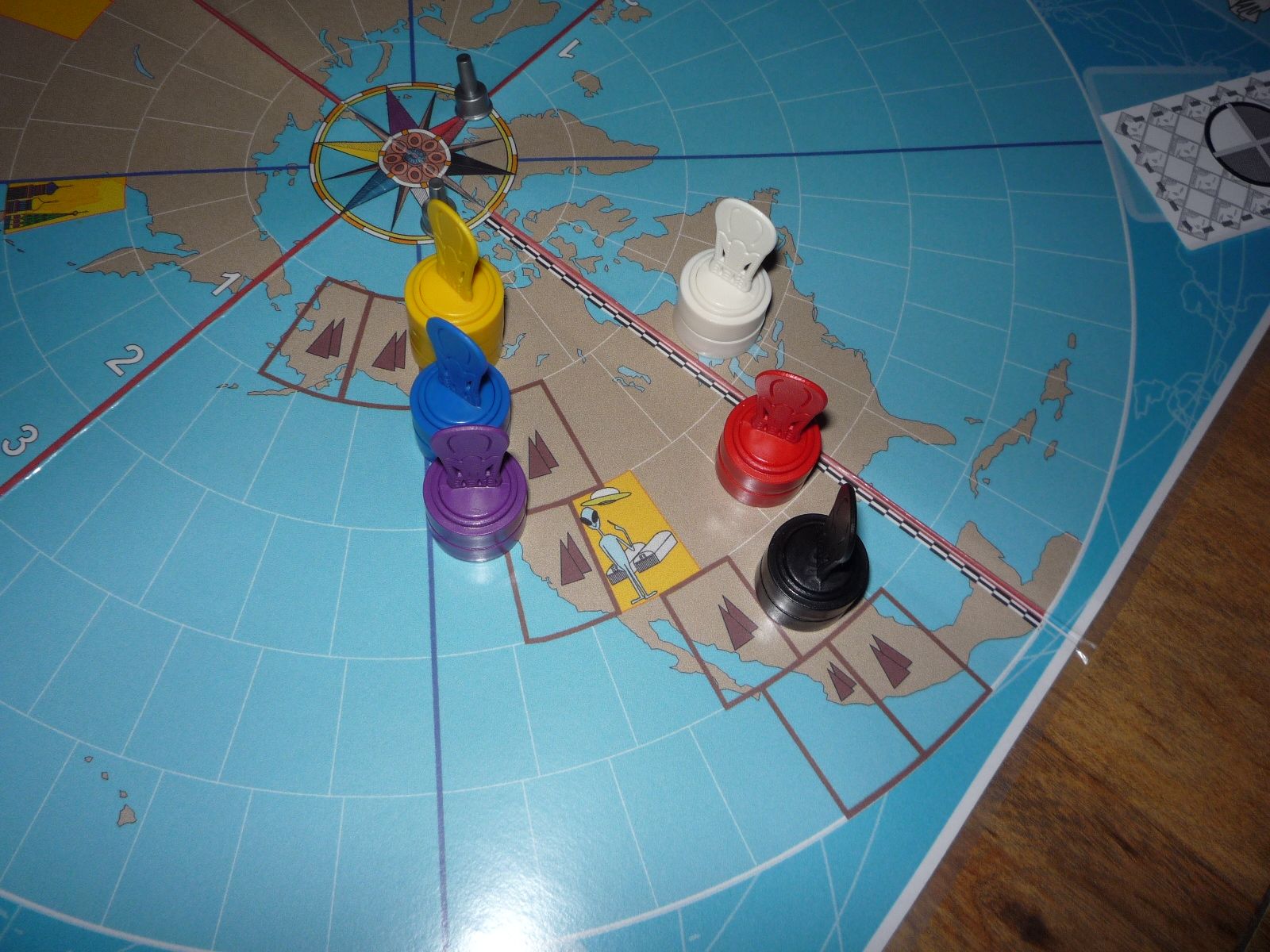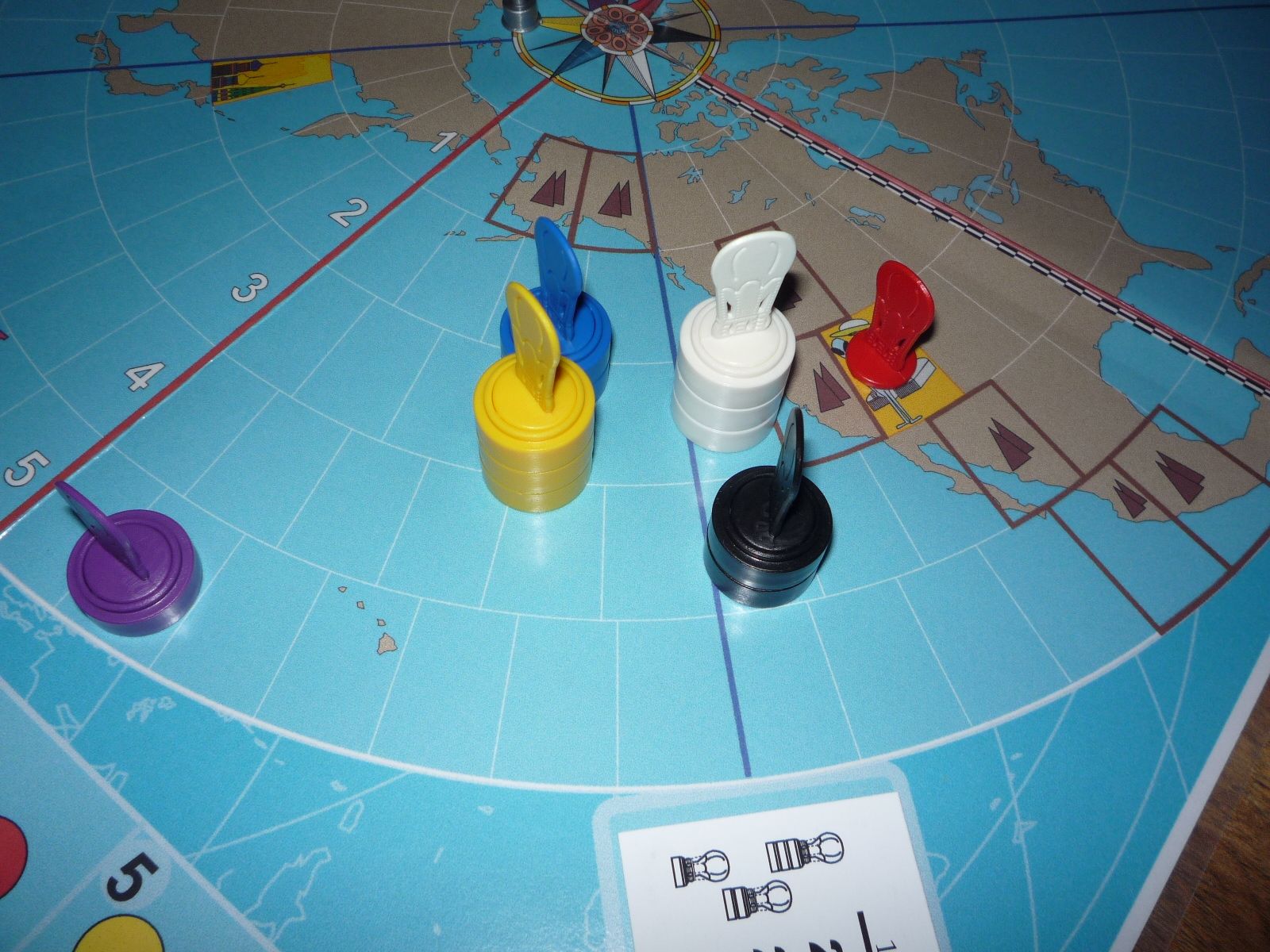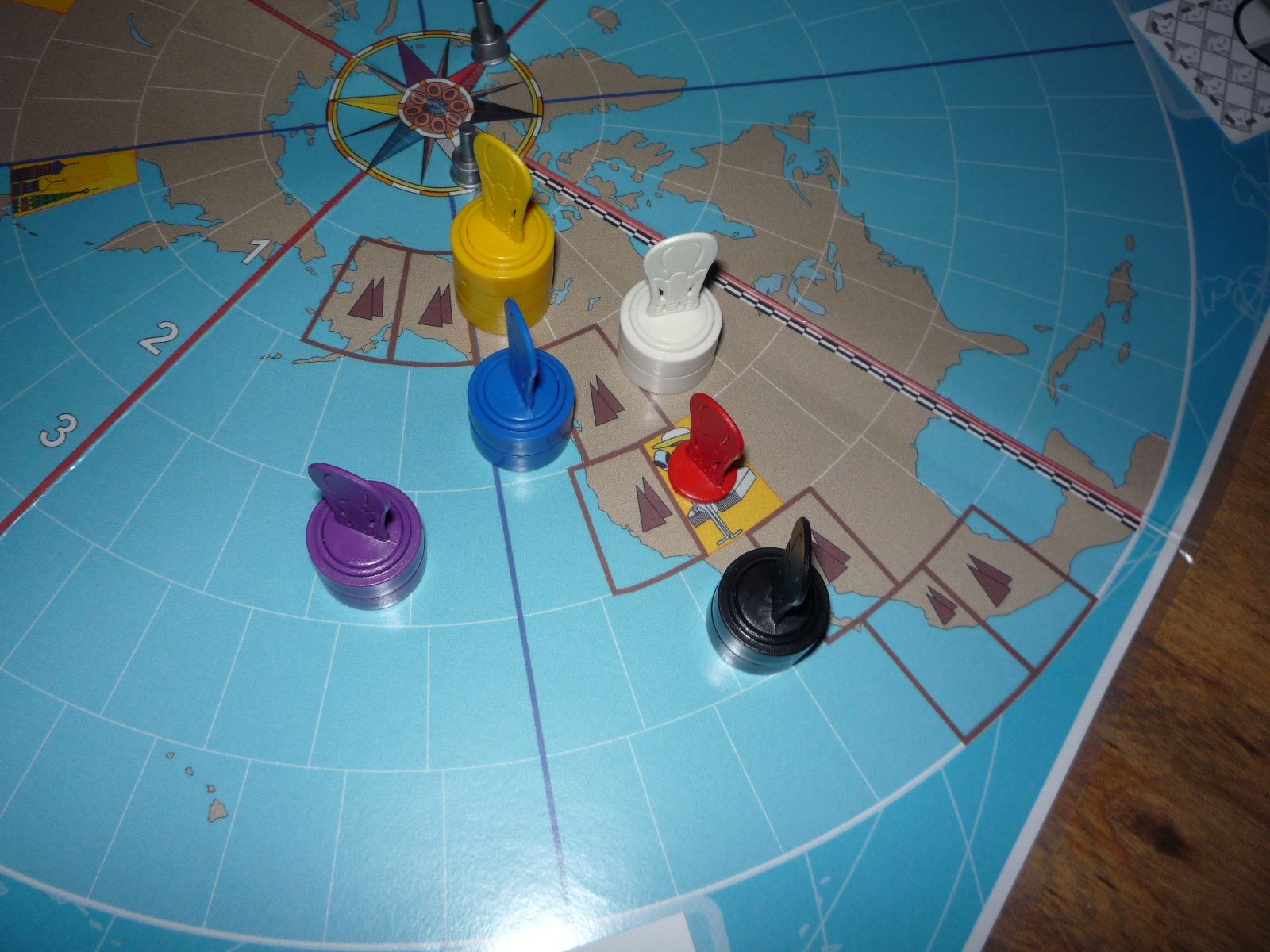 Black is forced to move south leaving Red in a clear lead as he sights the coasts of North America. All the rest have yet to see Hawaii.