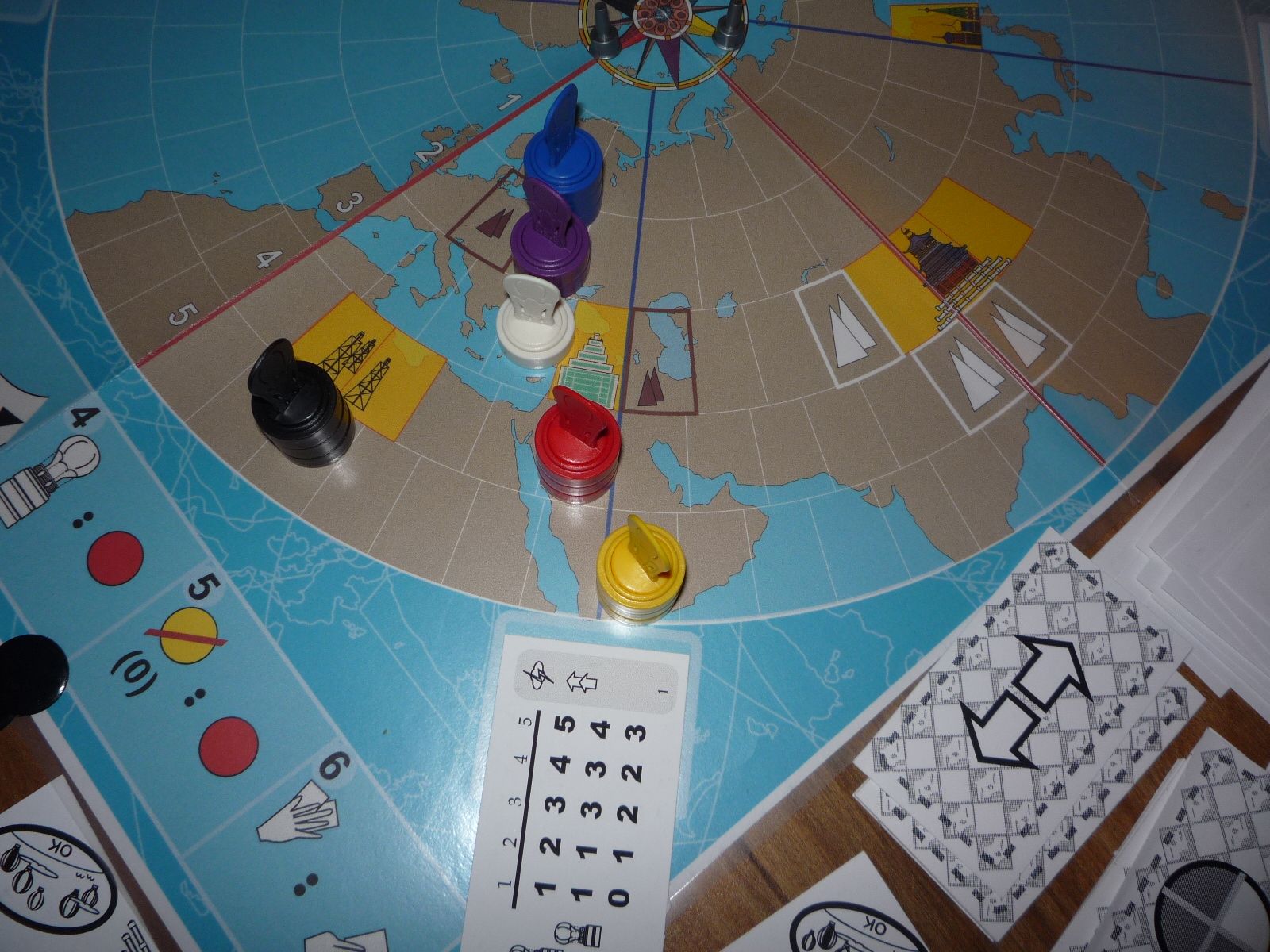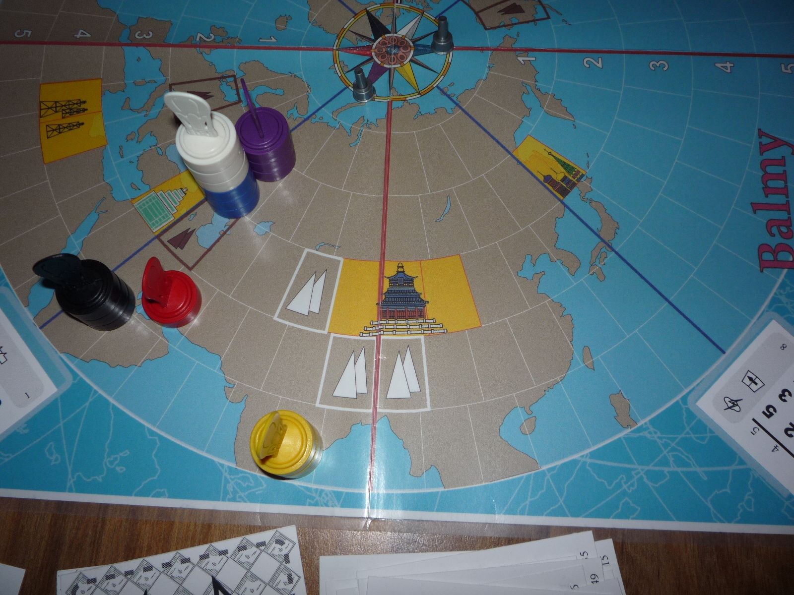 The winds change and Red and Black are able to take advantage by moving north. Yellow loses his lead when he cannot do the same. White and Blue are coming on, but bad winds force Purple into the Equatorial Doldrums.