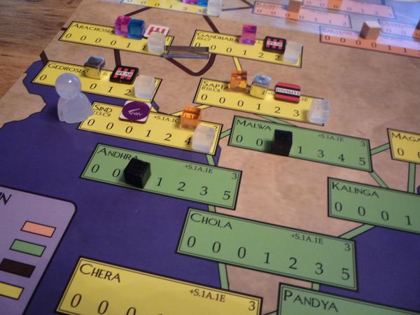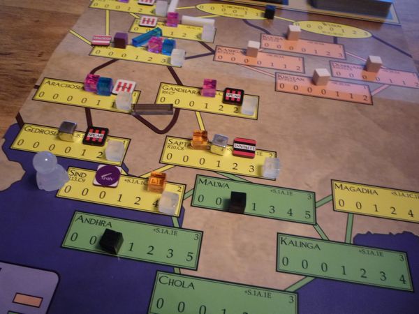 Trade and Pandemic. Each empire is a source of trade, which triggers via the appearance of the empire's trade card from its main deck. The player then passes this card to the discard pile of the next empire in the direction of trade. The map shows, for each province on a trade route, the amount of income trade provides if the player holds it. Critical junctures such as Egypt and Sind are worth considerably more than other provinces. When a trade card reaches the other end of the board, it returns to its point of origin and the cycle begins anew. The pandemic – the Antonine Plague – and immunity to it, work in similar ways.