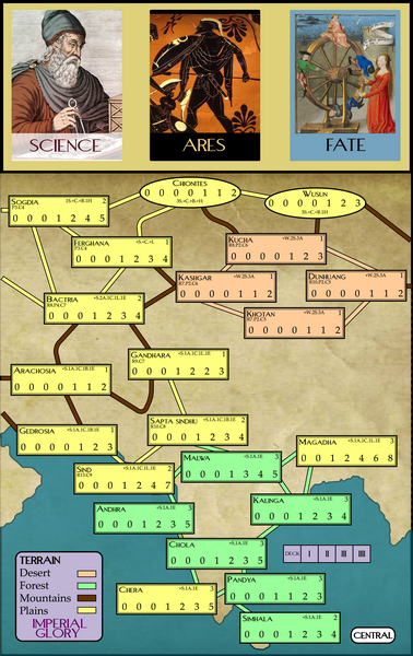 This first solo offering portrays the Kushan Empire. Future expansions will add to the map, on the west, Rome and Parthia, and on the east, Han Dynasty China.