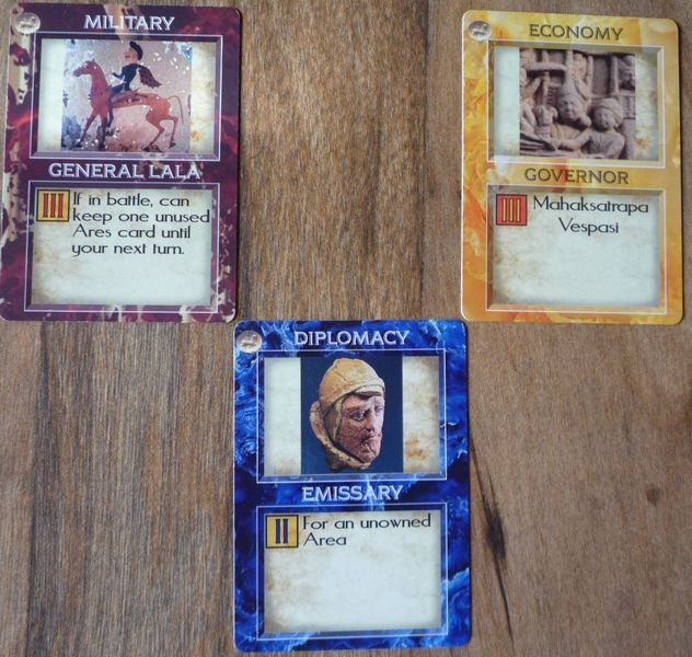 Solitaire with multi-player expansion. The Kushan Empire solitaire scenario has considerable scope for conquest since it starts with only a single territory and faces an empty map. But each neutral province has challenging defending forces that fight according to simple nonplayer rules. But all empires must face the often challenging Fate cards that can kill the emperor, disrupt provinces, trigger rebellions, civil wars, heresies, earthquakes, floods, coups, and more. Most devastating of all is the pandemic that probably brought the Four Empires era to an end.