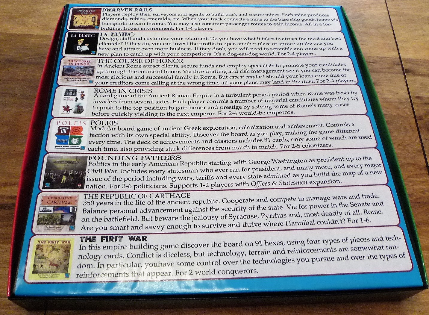 I own Italian Rails and like it a lot.. Thanks for that one too. I'll be buying Founding Fathers, both expansions, and Inventing the Future too. –Ben Baldanza